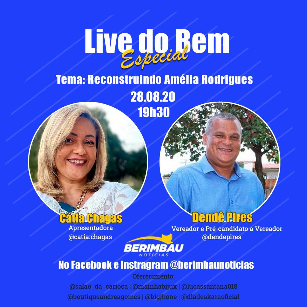 A Live do Bem acontecerá excepcionalmente nessa sexta-feira (28/8) para tratar de um tema de grande relevância para o município de Amélia Rodrigues, a sua Reconstrução. O convidado será o vereador Dendê Pires (PP).