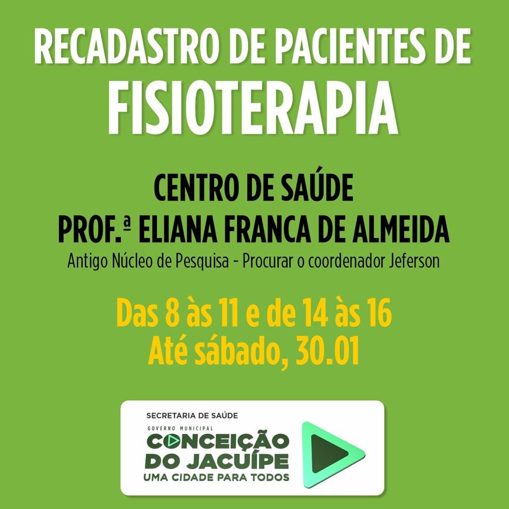 A Secretaria Municipal de Saúde de Conceição do Jacuípe informou na manhã desta quinta-feira (28/1) que está́ realizando o recadastramento dos pacientes de Fisioterapia.