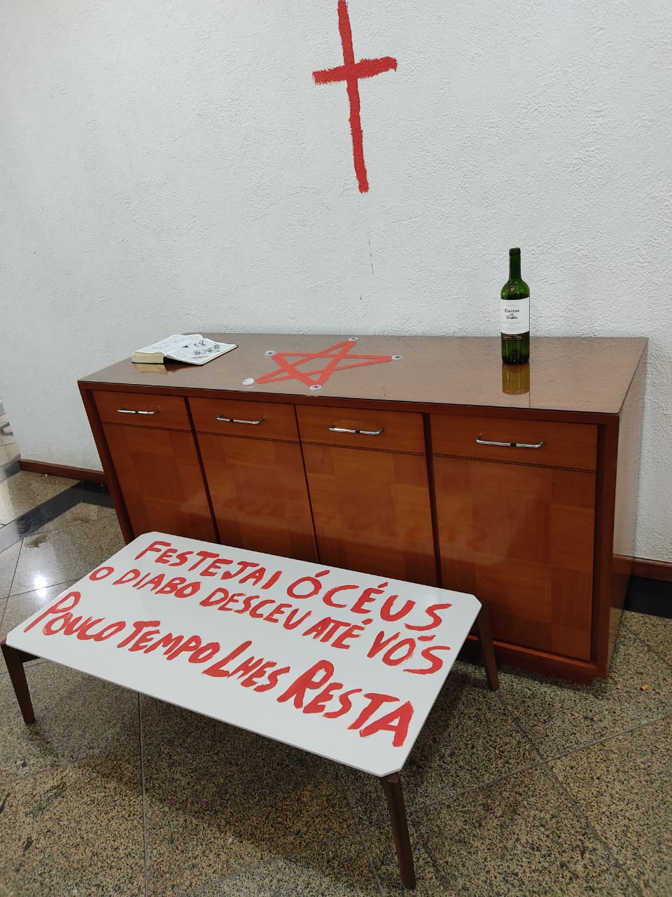 Relatos dos policiais que realizaram a perícia indicam que antes do crime houve um ritual demoníaco no apartamento. Em diversos cômodos da casa haviam o número 666 pintado em vermelho, em alusão à besta do apocalipse. Além disso, cruzes invertidas estavam em paredes e espelhos. Na sala, uma mensagem dizendo que o “diabo desceu até vós e pouco tempo lhe resta”.