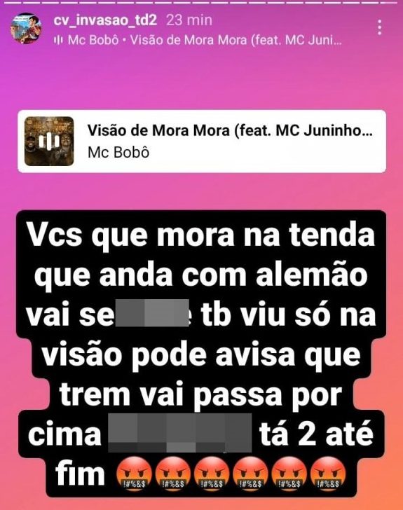 Os responsáveis pela execuções continuaram, por meio da ferramenta stories, os ataques. “Você que mora na [nome de construtora] que anda com alemão vai se f*** também. Pode avisar que o trem vai passar”, ameaça. “Quem faz ‘corre’ aí pro alemão pode ser qualquer um (Uber, moto, carrinho) procure porque o homem ‘soltou os pitbull’ dele”.