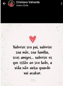 Em sua última publicação no Instagram, Cristiano compartilhou uma mensagem sugerindo aos seguidores: “Valorize seu pai, sua mãe, sua família e seus amigos … Valorize os que estão ao seu lado, a vida não avisa quando acaba”.