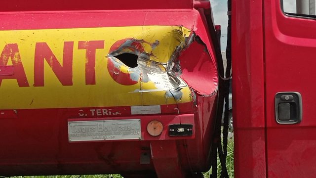O tenente Lucas do Corpo de Bombeiros, explicou que o condutor da caçamba tentou desviar de uma bicicleta quando atingiu o caminhão-tanque.