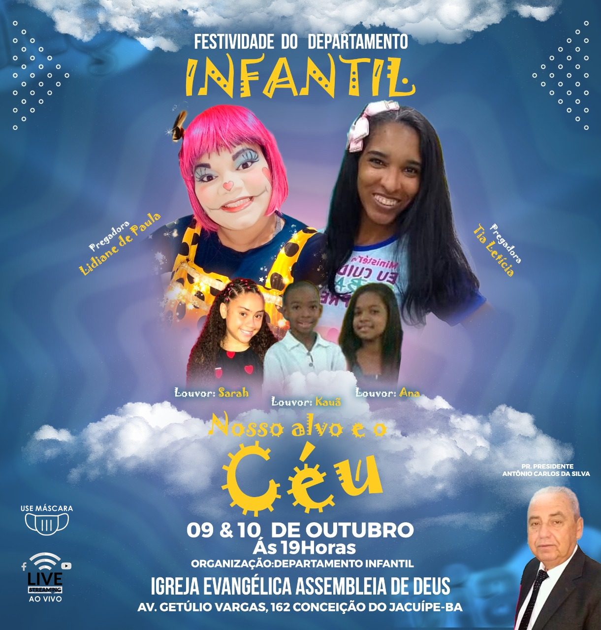 A Igreja Evangélica Assembleia de Deus realizará as festividades do Departamento Infantil nos dias 9 e 10 de outubro, as 19h. A igreja fica localizada na Avenida Getulio Vargas, em Conceição do Jacuípe.