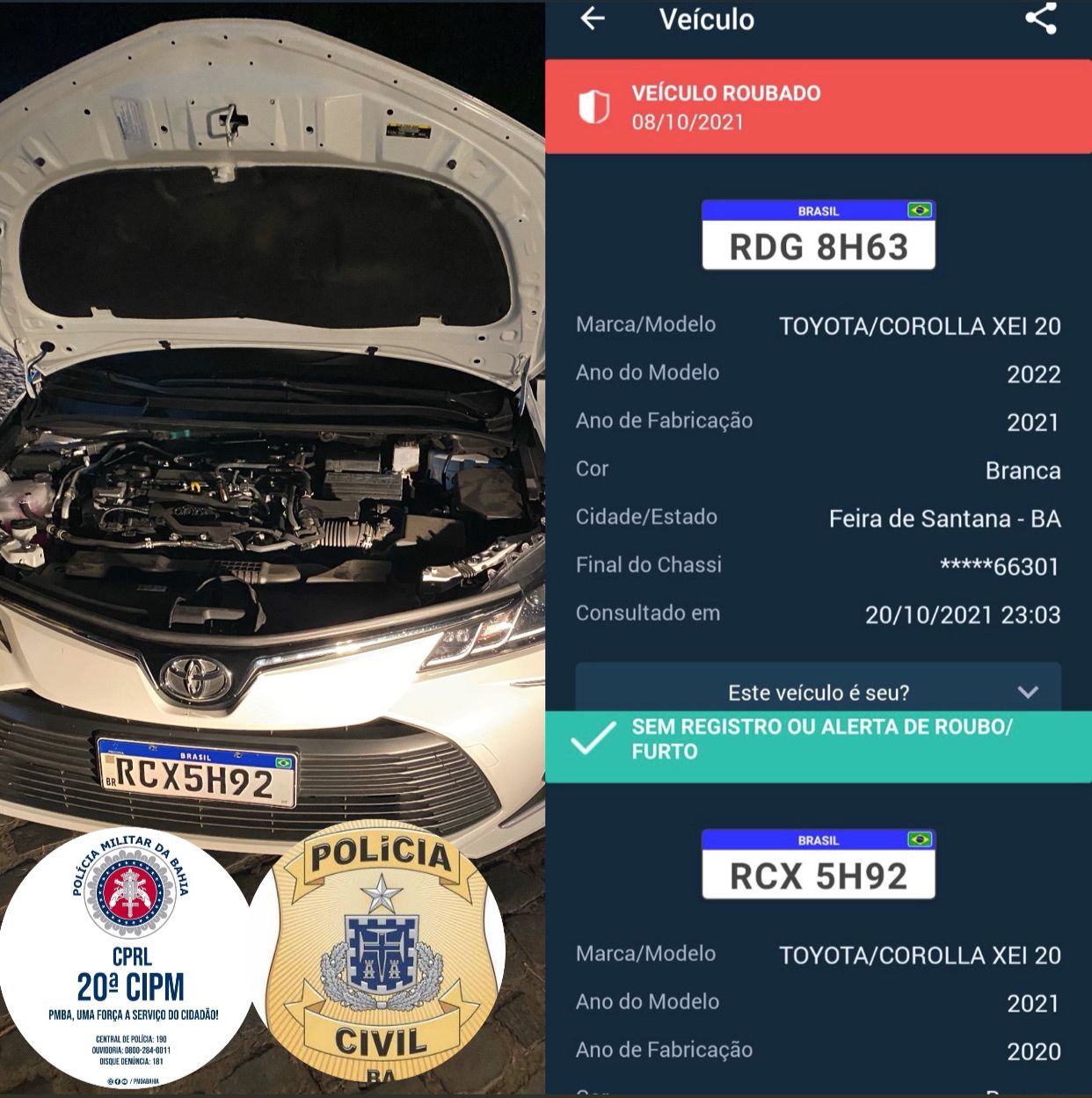 De posse das informações, a guarnição de Coração de Maria se deslocou para a localidade supracitada, acompanhada das guarnições de Conceição do Jacuipe, onde obtiveram êxito em localizar o veículo suspeito, que tinha placa RCX-5H92, com licença de Nova Soure, na Bahia.