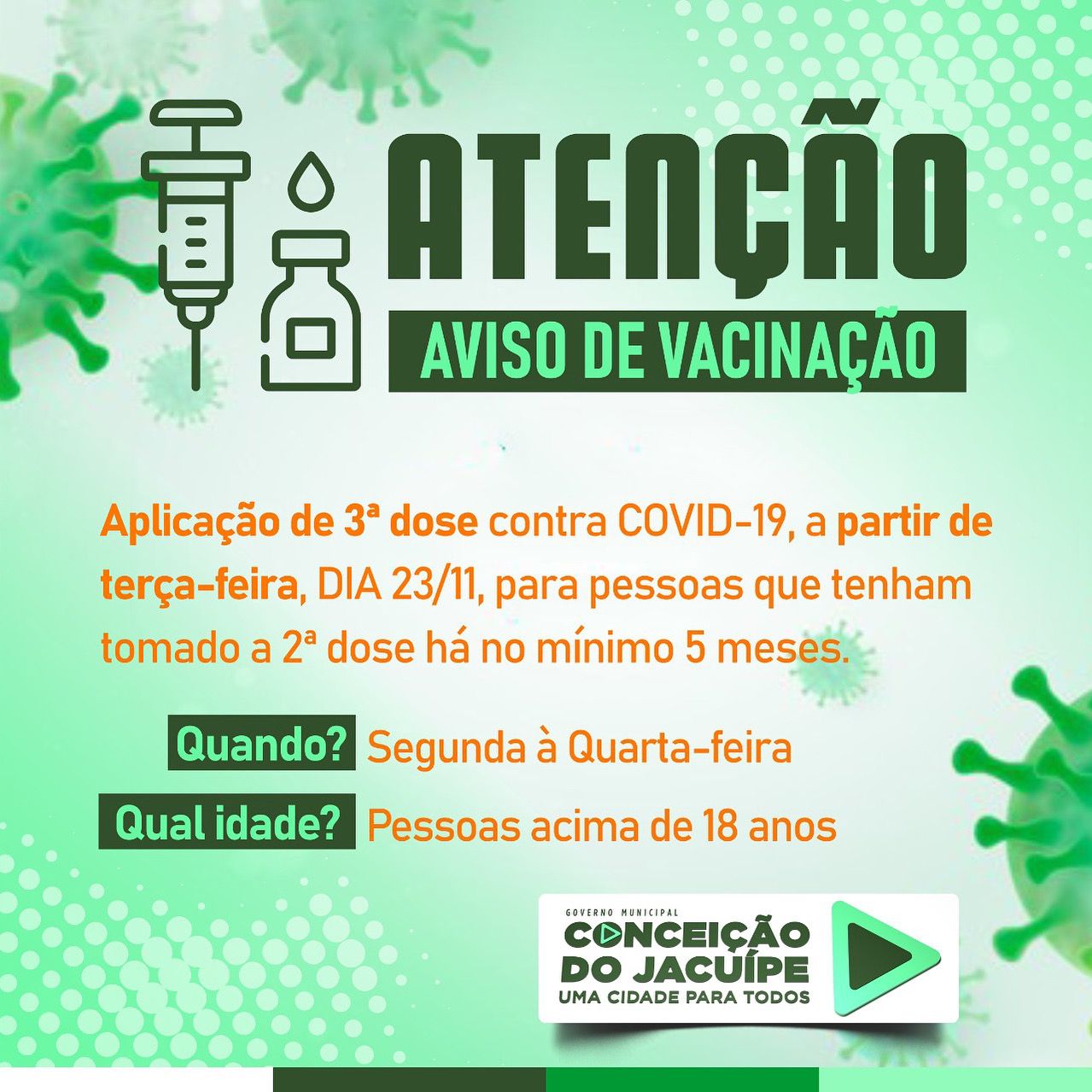 A partir de amanhã, dia 23 de novembro, está liberada a aplicação da 3ª dose da vacina contra a COVID-19 para pessoas acima de 18 anos em Conceição do Jacuípe.