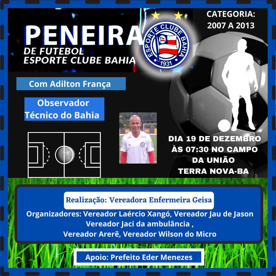 Dia 19 de dezembro, às 7h30 será realizada uma peneira de futebol do Esporte Clube Bahia no Campo da União, em Terra Nova.