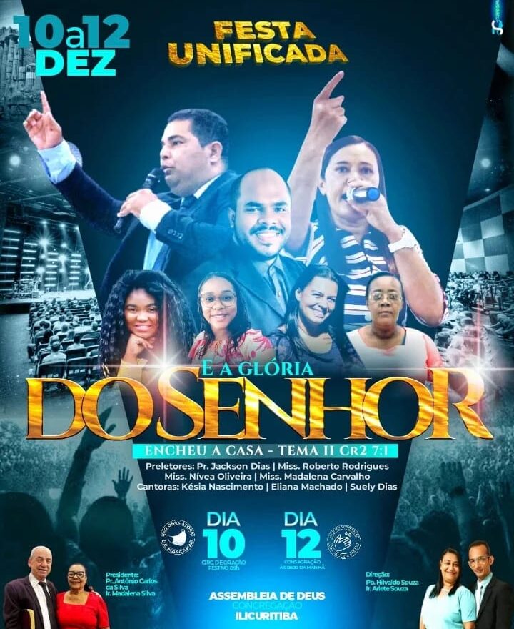 A Igreja Evangélica Assembleia de Deus realizará entre os dias 10 e 12 dezembro a Festa Unificada, com o tema “E a glória do Senhor encheu a casa”. Os círculos de oração acontecerão pela manhã a partir da 9h, e a noite, a partir das 19h.