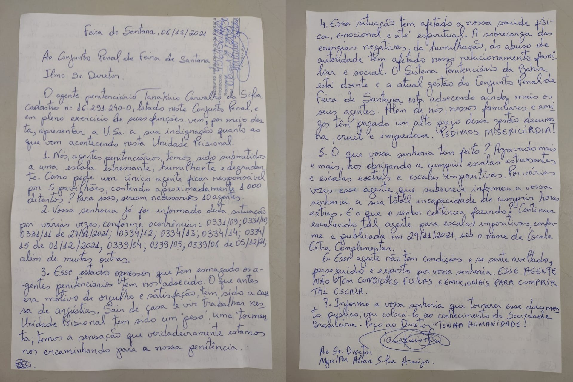Na carta, o Policial Penal identificado como Tanakio Carvalho, relata que ele e outros policiais são submetidos a uma escala de trabalho insustentável, que ele descreve como “estressante, humilhante e degradante”. Conforme o denunciante, a situação é tão grave que um agente chega a ficar responsável por cinco pavilhões, custodiando um total de 1000 detentos.