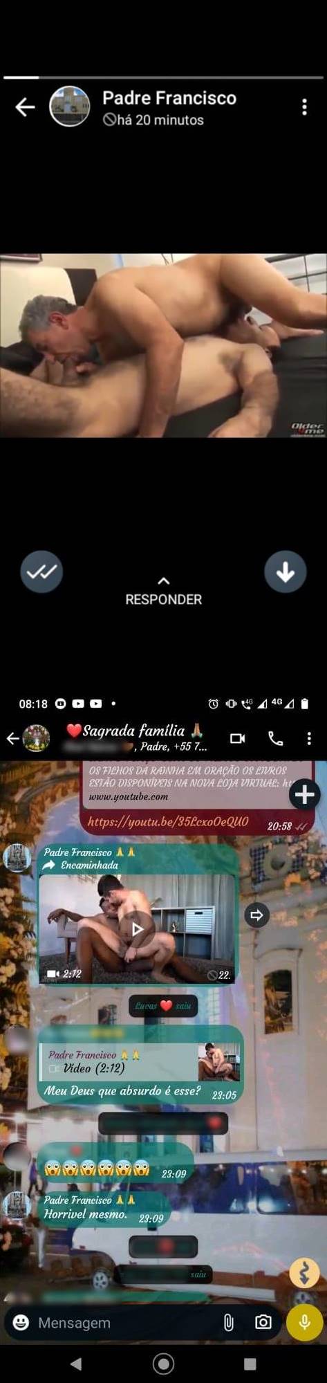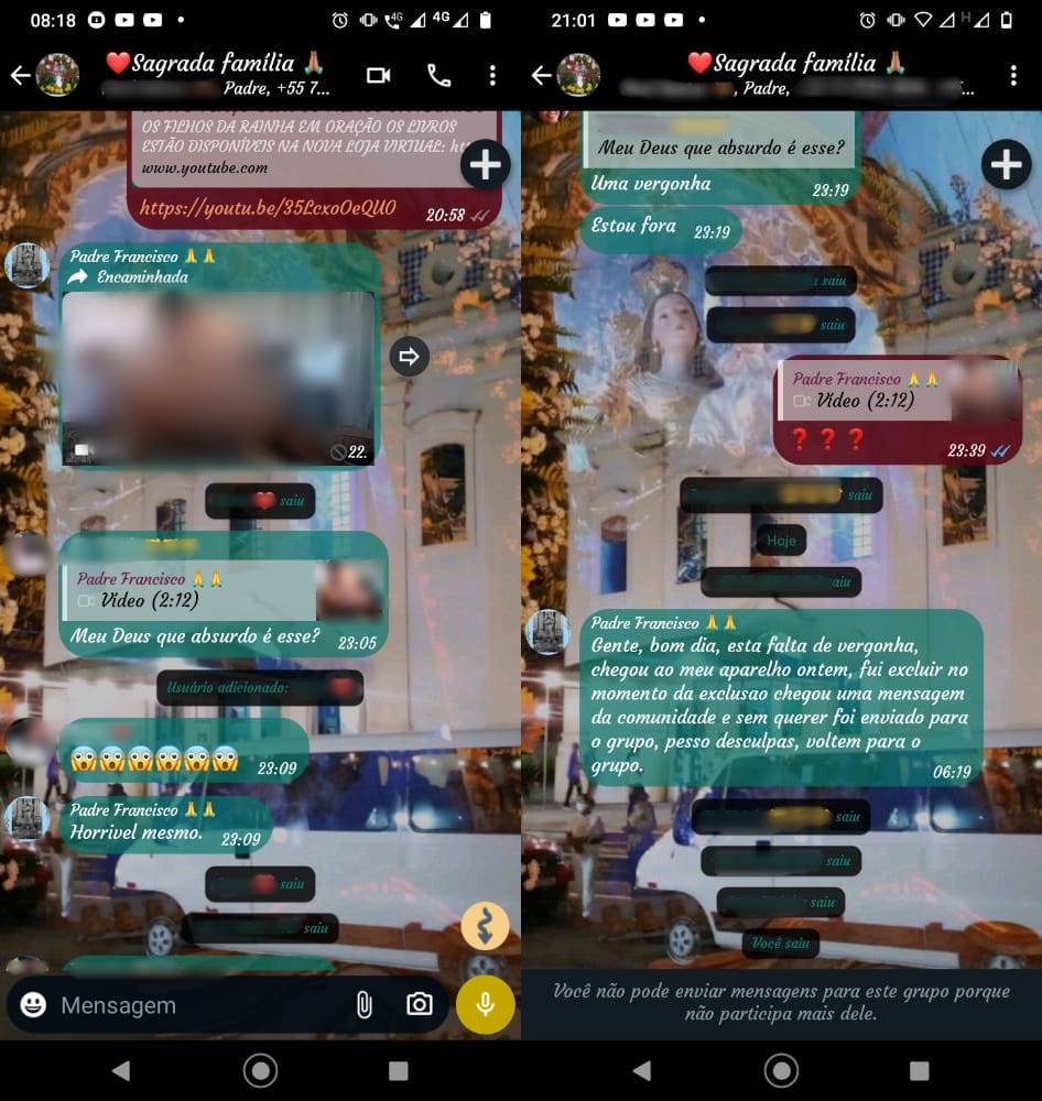 Outros populares disseram que os arquivos também foram compartilhados nos status do WhatsApp e que o padre já havia feito o mesmo outras vezes em grupos diferentes, no entanto, os participantes teriam se calado.