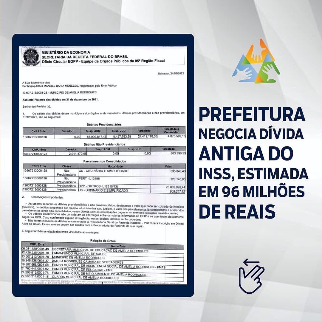 A Prefeitura Municipal de Amélia Rodrigues informa que a soma do débito do INSS, no valor de R$ 96 milhões de reais, vem de anos anteriores da posse da atual administração e são referentes a saldos de dívidas do município e dos órgãos vinculados, de débitos previdenciários e não previdenciários até o ano de 2020.