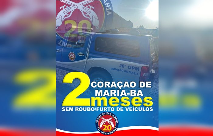 A Polícia Militar de Coração de Maria informa que entre o final do mês de Janeiro e final de março, ou seja, 60 dias, não se registrou nenhum roubo/furto de carro ou moto no município. Os números são extremamente positivos se comparados a cidades de mesmo porte.