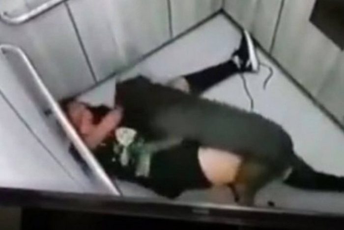 Depois, a mulher faz um esforço para se sentar e começa a bater freneticamente nos botões do elevador com as mãos cobertas de sangue antes de conseguir escapulir para o saguão. A cena foi registrada por câmera de segurança.