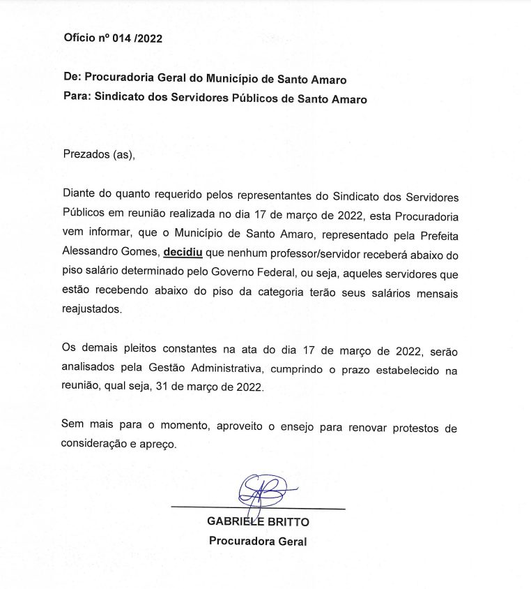 Após inúmeras tentativas de negociação, a gestão enviou um ofício a categoria, especificando um reajuste que não reajusta a tabela, ou seja, descumpre a lei, e comtempla apenas os professores de Nível Médio, que ainda recebem salários abaixo do piso.