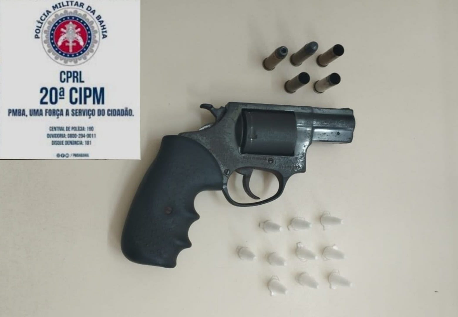 Com o suspeito foram apreendidos: um revólver Rossi, calibre .38, n° de série AA430329; dois cartuchos Calibre .38; três estojos calibre .38; dez ependorfes contendo substâncias análoga à cocaína.