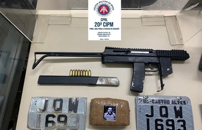 Ainda de acordo com a polícia, ao desembarcar da viatura, os militares foram recebidos a tiros, não restando outra opção a não ser repelir a injusta agressão. Cessado os disparos, foi feito o processo de busca e acompanhamento no local, tendo sido encontrado ao solo um indivíduo com o seguinte material: uma submetralhadora artesanal Cal.9mm, um tablete de uma substância análoga à cocaína, um carregador alongado, oito munições Cal.9mm e duas placas de motocicletas.