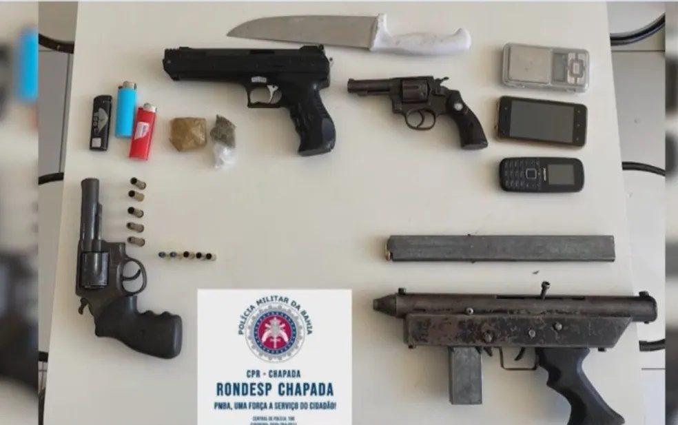 Na ação, foram apreendidos dois revólveres, uma submetralhadora de fabricação artesanal, um simulacro de arma de fogo e 17 cartuchos.