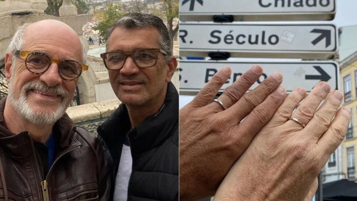 O ator Marcos Caruso, de 70 anos, surpreendeu os seguidores ao revelar que se casou com o técnico de enfermagem Marcos Paiva. Os dois estão viajando pela Europa e, em Portugal, trocaram as alianças.