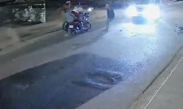 O caso aconteceu na noite de quarta-feira (4/10), no conjunto habitacional Feira 7, que fica no bairro Tomba. As imagens mostram que uma mulher e três homens, que estavam em duas motocicletas, conversavam no passeio da rua El Salvador.