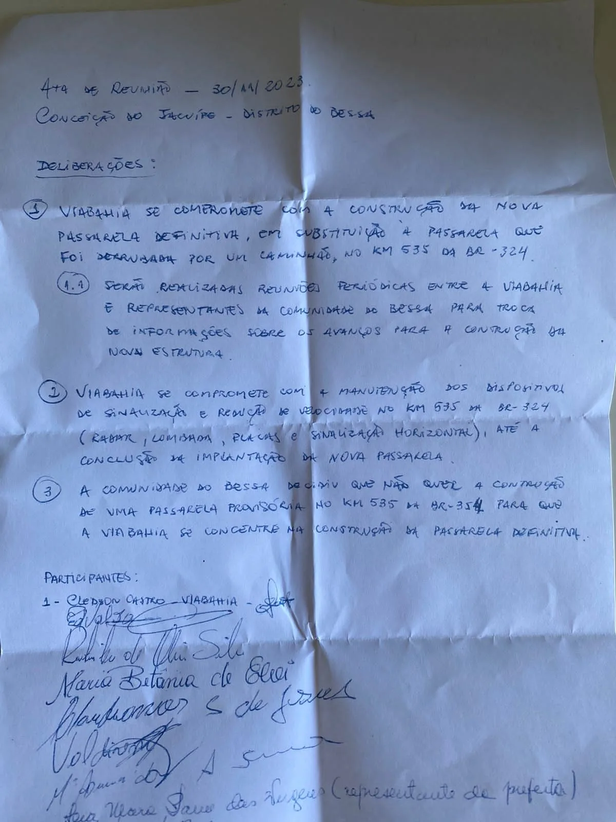 Através de um documento escrito à mão pelo representante da concessionária e assinado por todos os presentes, foi formalizado o compromisso da Via Bahia em construir uma passarela definitiva. Além disso, acordou-se a realização de reuniões periódicas para manter a comunidade informada sobre o progresso da construção da nova estrutura.
