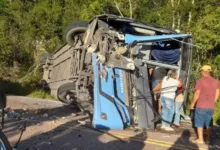 Ainda de acordo com a Polícia Rodoviária Federal, duas pessoas tiveram ferimentos leves, entre elas o motorista do caminhão. A PRF informou que as suspeitas são de que os dois veículos entraram na curva “muito abertos” e o caminhão acabou atingindo lateralmente o ônibus.