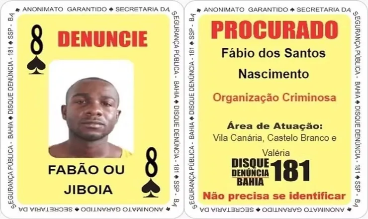 O criminoso possuía três mandados de prisão em aberto e estava envolvido em diversas atividades criminosas, incluindo a articulação de “bondes” – grupos de criminosos fortemente armados – para atacar traficantes rivais na capital baiana. Devido ao seu alto nível de periculosidade, Fábio dos Santos Nascimento foi incluído no Baralho do Crime da SSP, uma ferramenta que reúne informações sobre os foragidos mais perigosos da Bahia, incentivando a população a fornecer denúncias anônimas que auxiliem na localização desses indivíduos.