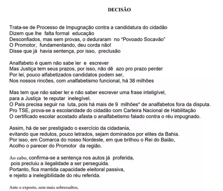 Em uma sentença criativa e única, o juiz José de Souza Brandão Netto, da 123ª Zona Eleitoral de Araci, na Bahia, rejeitou o pedido de impugnação da candidatura de Zé de Migué, agricultor de 54 anos e candidato a vereador de Teofilândia pelo Partido Progressista (PP), acusado de ser analfabeto. A decisão, proferida na quinta-feira, 26 de setembro, inovou ao utilizar versos de cordel, uma expressão tradicional da cultura nordestina, para afastar as acusações.