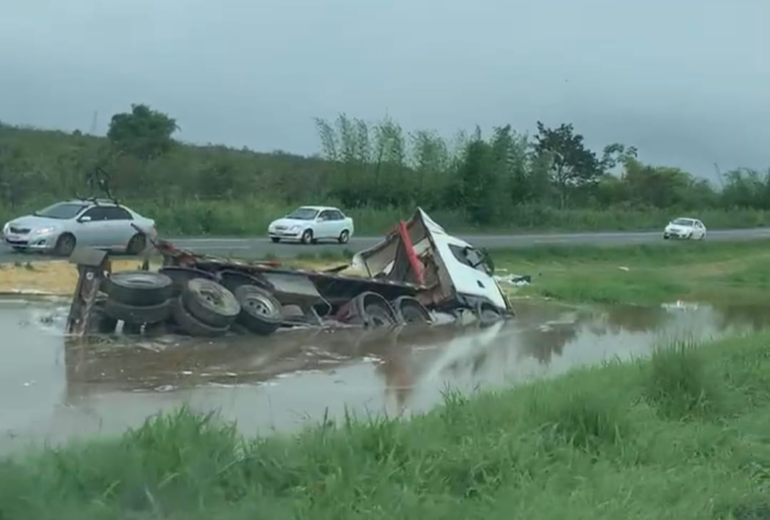 Uma carreta tombou em uma área alagada da BR-324, no trecho entre os municípios de Santo Amaro e Candeias. O veículo virou em meio à vegetação que separa os dois sentidos da rodovia na tarde deste domingo (4). Apesar do impacto, não houve registro de vítimas.