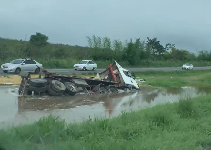 Uma carreta tombou em uma área alagada da BR-324, no trecho entre os municípios de Santo Amaro e Candeias. O veículo virou em meio à vegetação que separa os dois sentidos da rodovia na tarde deste domingo (4). Apesar do impacto, não houve registro de vítimas.