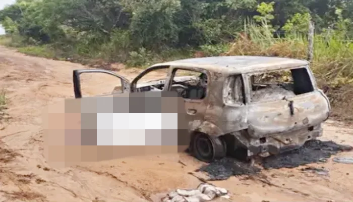 Corpo carbonizado é encontrado ao lado de carro incendiado em estrada de terra