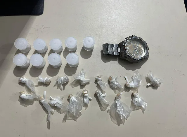 Durante a busca pessoal, os policiais encontraram com o suspeito, identificado pelas iniciais J.S.V, os seguintes itens: 16 pedras de crack; 09 embalagens contendo cocaína; 01 relógio e um aparelho celular.