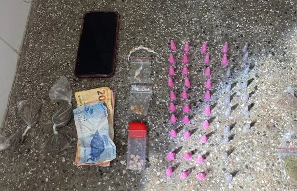 Durante a abordagem, foram encontrados no interior do saco 42 pinos de substância análoga à cocaína, 24 pedras de crack, 7 trouxas de maconha, R$ 42 em dinheiro e um aparelho celular da marca Apple.
