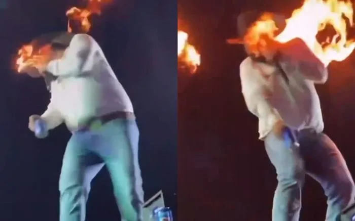 Imagens do momento mostram quando o artista é surpreendido pelas chamas, jogando o chapéu no chão e apagando o fogo com as próprias mãos, antes mesmo da chegada da equipe de apoio. Léo recebeu atendimento médico ainda no local.