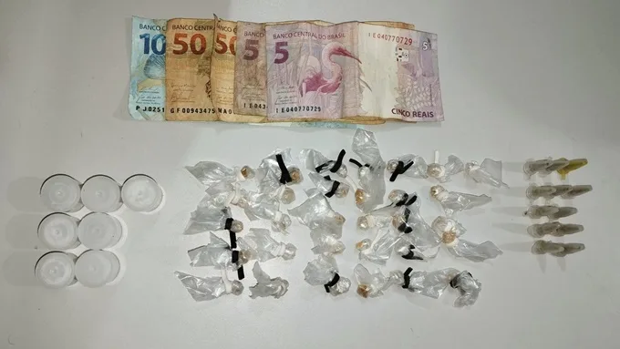 Na busca pessoal, foram encontrados sete frascos de substância análoga à cocaína, 31 pedras de crack, 12 pinos contendo maconha (extração) e R$ 210,00 em espécie. A motocicleta também foi apreendida.