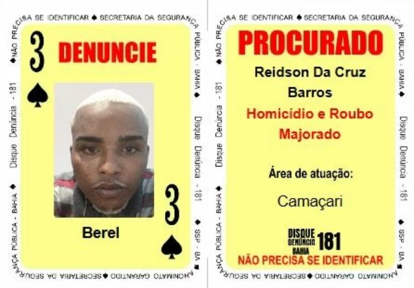 A Secretaria da Segurança Pública da Bahia (SSP-BA) incluiu, na manhã desta quinta-feira (7), Reidson da Cruz Barros, conhecido como “Berel”, no Baralho do Crime, ferramenta que reúne os criminosos mais procurados do estado. Ele passa a ocupar a carta “3 de Espadas”.
