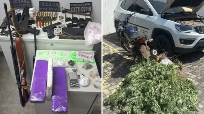 Na operação foram apreendidas 2 submetralhadoras, 3 espingardas, 1 pistola, 1 revólver, Munições e carregadores, cerca de 4 kg de entorpecentes, pés de maconha, 1 automóvel e 3 motocicletas.