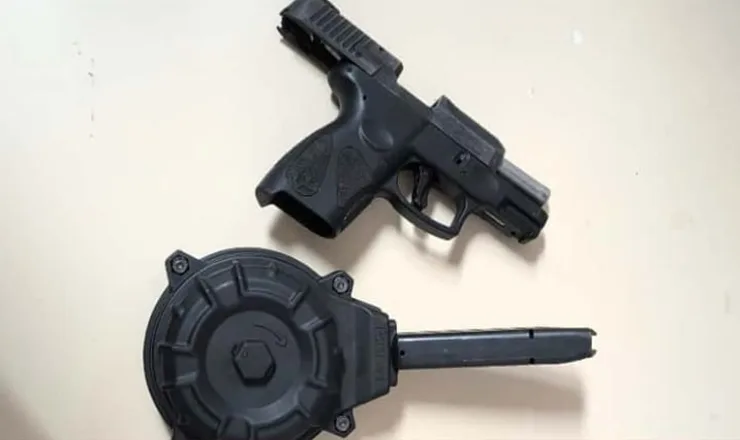 Com o preso, os militares apreenderam uma pistola Taurus calibre 9mm, de numeração AB7284491, um carregador alongado com capacidade para 50 munições e 16 munições intactas do mesmo calibre.