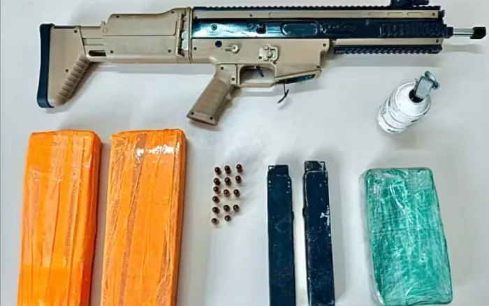 No local, os policiais encontraram o suspeito e apreenderam: 1 submetralhadora calibre 9mm adaptada; 2 carregadores alongados; 15 munições calibre 9mm; 1 granada de efeito moral;1,2 kg de substância análoga ao crack; 2,96 kg de substância análoga à maconha.
