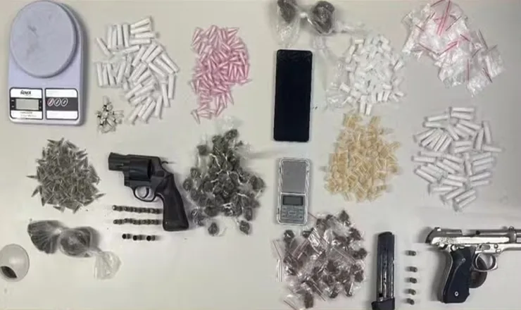 Com os homens, a PM apreendeu uma pistola, um revólver, 10 munições, três estojos, além de porções de cocaína, maconha e crack. Também foram encontrados uma balança de precisão e um celular.