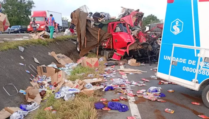 Conforme a PRF, os caminhões, que transportavam cargas de frutas e café, colidiram frontalmente. Imagens feitas por pessoas que passaram pelo local mostram que um dos veículos ficou completamente destruído.