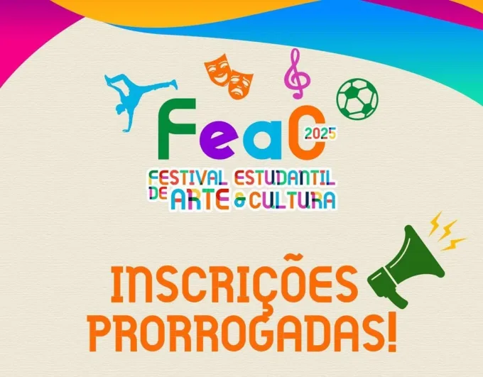A Prefeitura de Conceição do Jacuípe, por meio da Secretaria de Cultura, Esporte e Turismo, anunciou a prorrogação das inscrições para o FEAC 2025 — Festival Estudantil de Arte e Cultura, que agora poderão ser realizadas até o dia 10 de outubro (sexta-feira).
