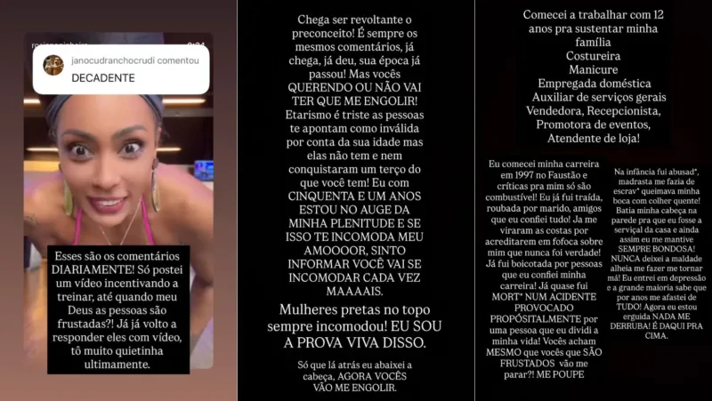 A dançarina baiana Rosiane Pinheiro, de 51 anos, emocionou seguidores ao transformar uma ofensa em um desabafo de força e superação. Após ser chamada de “decadente” por um internauta, a artista publicou um relato comovente em suas redes sociais na quarta-feira (8), relembrando episódios de violência, racismo e dificuldades enfrentadas ao longo da vida.