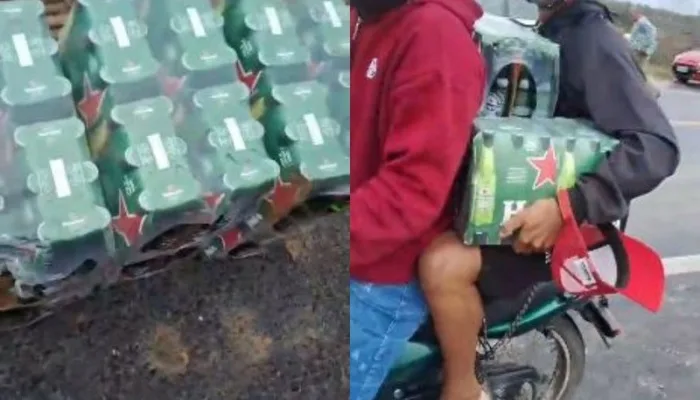 Imagens que circulam nas redes sociais mostram dezenas de pessoas subindo na carreta e retirando engradados e caixas de cerveja. Algumas ajudam a carregar os produtos enquanto outras apenas observam a cena. O saque ocorreu pouco tempo após o tombamento do veículo.