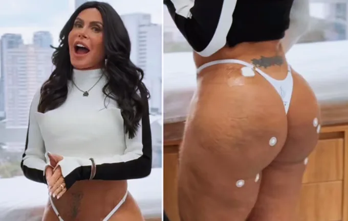 Dois dias antes, Gretchen também exibiu um dos tratamentos estéticos que realiza para cuidar dos glúteos. Ela esteve em uma clínica em São Paulo para mais uma aplicação de PMMA (polimetilmetacrilato), substância sintética usada como preenchimento permanente.