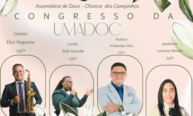 A Assembleia de Deus – Oliveira dos Campinhos, distrito de Santo Amaro promove, nos dias 22 e 23 de novembro, o Congresso da UMADOC (União da Mocidade da Assembleia de Deus de Oliveira dos Campinhos), com o inspirador tema “Mulheres Eleitas aos Pés da Cruz”. O evento será realizado a partir das 18h30, na quadra do CEMOC, e promete ser um momento de fé, louvor e comunhão cristã.