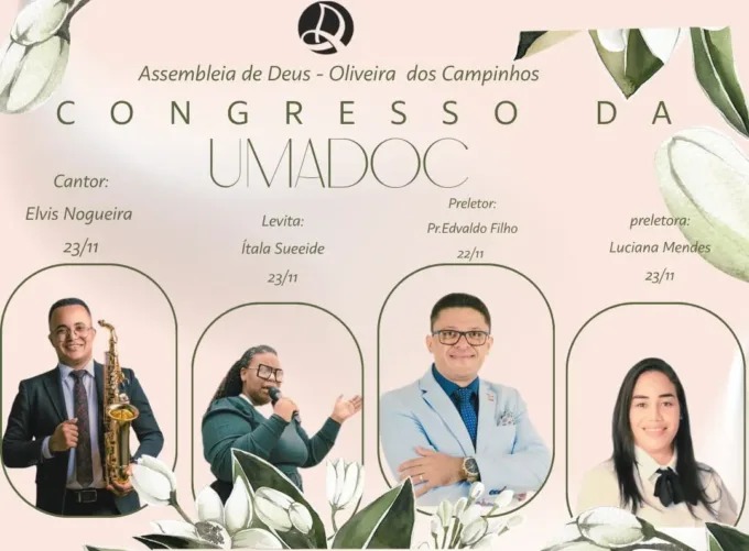 A Assembleia de Deus – Oliveira dos Campinhos, distrito de Santo Amaro promove, nos dias 22 e 23 de novembro, o Congresso da UMADOC (União da Mocidade da Assembleia de Deus de Oliveira dos Campinhos), com o inspirador tema “Mulheres Eleitas aos Pés da Cruz”. O evento será realizado a partir das 18h30, na quadra do CEMOC, e promete ser um momento de fé, louvor e comunhão cristã.
