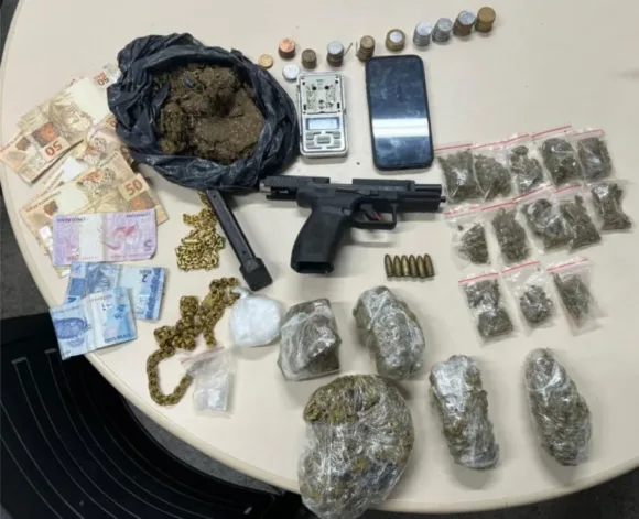 A operação resultou na apreensão de uma pistola Canik modelo TP9SF, munições de diversos calibres, porções de maconha e cocaína, uma balança de precisão, celular iPhone 15 Pro Max, joias, R$ 330 em espécie, e uma motocicleta Honda/CG 125 Fan, com restrição de furto ou roubo.