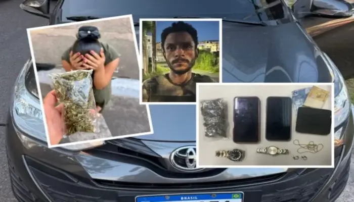 Os policiais interceptaram um Toyota Yaris cinza após suspeitarem da atitude dos ocupantes. Durante a abordagem, foi realizada busca pessoal no casal, quando uma porção grande de maconha foi encontrada dentro da bolsa da mulher.