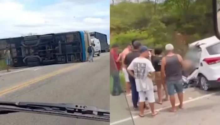 Informações preliminares dão conta que os veículos transitavam em sentidos opostos, quando aconteceu o acidente. O lado mais atingido do carro foi o do motorista. Com a batida, o coletivo, que transportava 19 pessoas, tombou na rodovia.