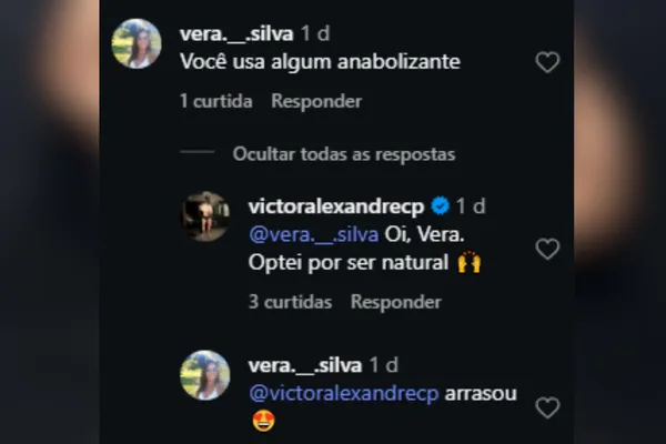 A boa forma do rapaz chamou atenção dos seguidores, e uma usuária identificada como Vera Silva questionou se ele utilizava hormônios para potencializar o ganho de massa muscular. “Você usa anabolizante?”, perguntou. Victor respondeu de forma direta, negando qualquer uso de substâncias. “Oi, Vera. Optei por ser natural”, afirmou.