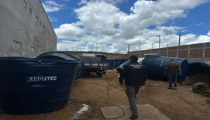 A operação ocorreu em um galpão localizado na BR-116, no bairro Lagoa Grande, após denúncia anônima. No local, foram encontradas caixas d’água de 5.000 litros com parte das inscrições apagadas com solvente. O responsável pelo espaço informou que recebia pagamento para realizar o serviço e fazer a entrega na zona rural de Manoel Vitorino.